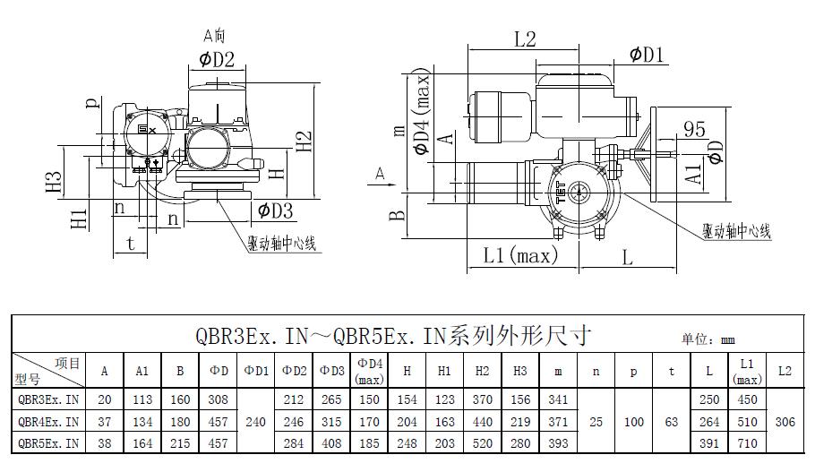QBR3~QBR5是我公司研制的部分回轉(zhuǎn)閥門電動(dòng)裝置,控制轉(zhuǎn)矩范圍:900N.m~12000N.m。該電動(dòng)裝置可與球閥﹑蝶閥等閥瓣做90°回轉(zhuǎn)的閥門組合成電動(dòng)閥門,其功能是控制閥門的啟閉。該電動(dòng)裝置能夠進(jìn)行單機(jī)或多機(jī)室內(nèi)控制遠(yuǎn)距離控制電動(dòng)操作和現(xiàn)場(chǎng)手動(dòng)或電動(dòng)操作,可廣泛地應(yīng)用在具有管道閥門的工業(yè)系統(tǒng)。該產(chǎn)品的防護(hù)等級(jí)為IP67,隔爆型產(chǎn)品(型號(hào)中有Ex)的隔爆等級(jí) 為dⅡBT4。